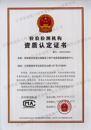 國家城市軌道交通建設工程產品質量監(jiān)督檢驗中心, 依托江蘇省建筑科學研究院和江蘇省建筑工程質量檢測中心在城市軌道交通建設工程領域的綜合技術優(yōu)勢,于2016年10月獲得國家認證認可監(jiān)督委員會批準授權..